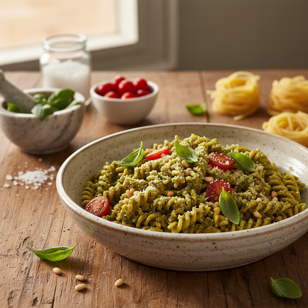 - Kokkusegamine: Kurna pasta ja vala see koheselt pesto-vee segusse. Sega energiliselt umbes minut aega. Kuum pasta imab endasse kastme maitseid ja tärklisevesi muudab kõik ühtlaseks. Kui tundub liiga kuiv, lisa järk-järgult ülejäänud pastavett.