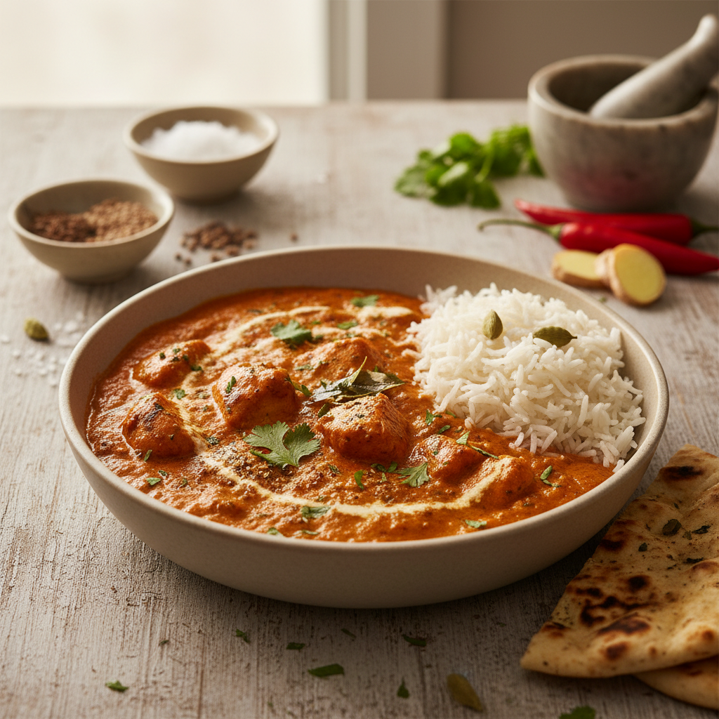 - Ühendamine ja viimistlus: Püreesta kaste saumikseriga, kui soovid restoranilikult siidist tulemust (see samm on vabatahtlik). Lisa küpsetatud kanatükid kastmesse. Vala juurde koor ja puista sisse peopesade vahel purustatud Kasuri Methi (lambaläätse lehed) ning veidi garam masalat.
