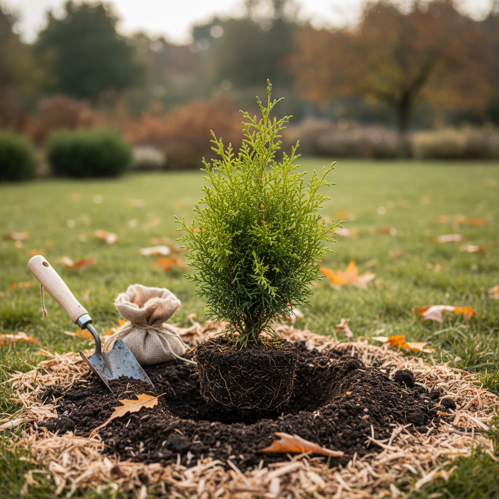- Lisage põhja kompostikiht või spetsiaalne okaspuuväetis, et soodustada juurdumist.