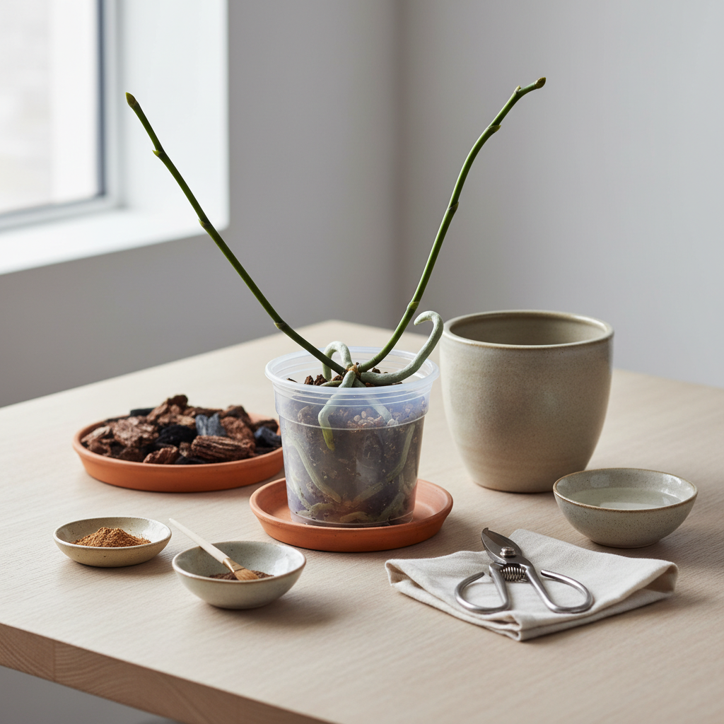 - Uus pott: Kuukingade (Phalaenopsis) puhul eelistage läbipaistvat plastpotti. See võimaldab juurtel osaleda fotosünteesis ja teil on lihtne jälgida juurte tervist ning niiskustaset. Uus pott peaks olema vaid 1-2 cm suurema läbimõõduga kui eelmine. Liiga suur pott hoiab liigselt niiskust.