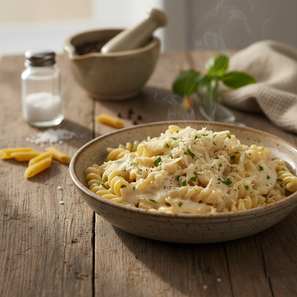 - Maitsestamine ja juust: Lisa kastmele riivitud juust, segades pidevalt, kuni juust on sulanud. Maitsesta värskelt jahvatatud musta pipra ja vajadusel vähese soolaga (arvesta, et juust on juba soolane).